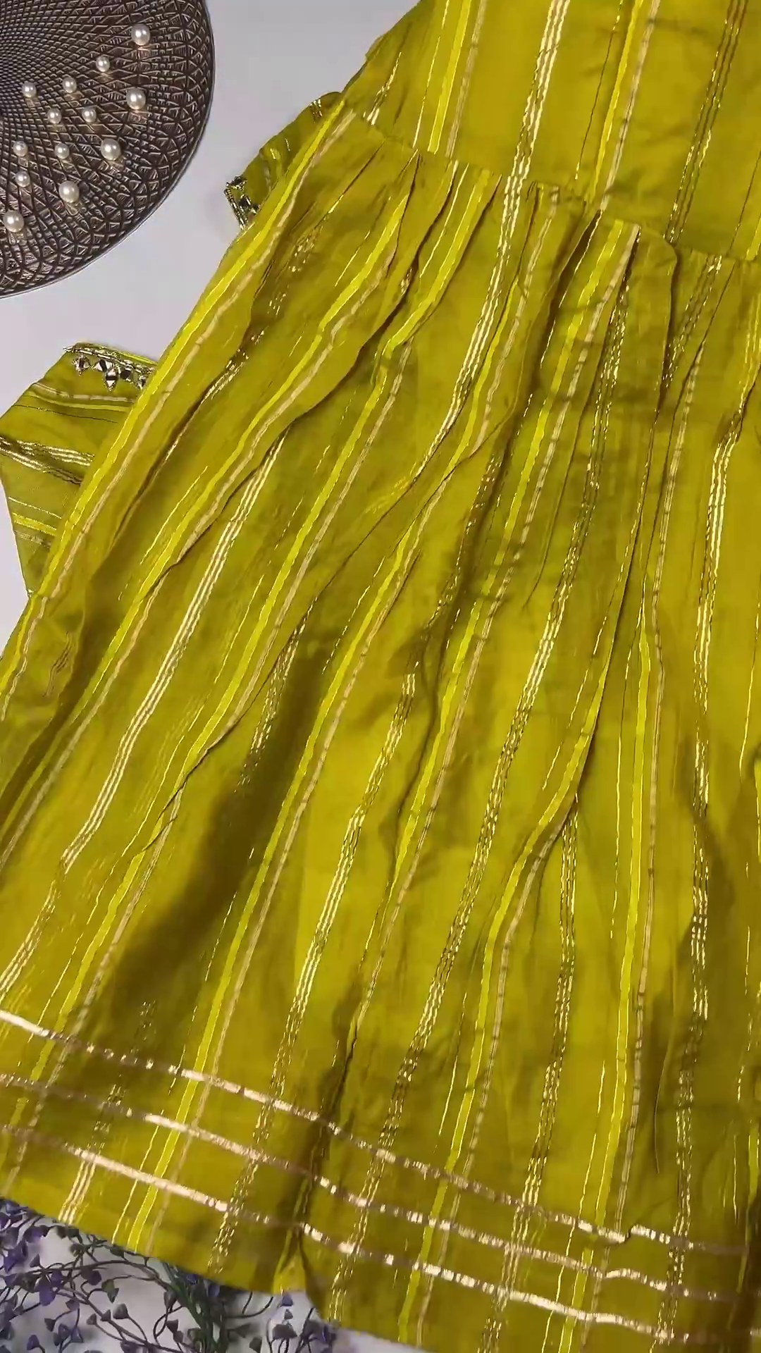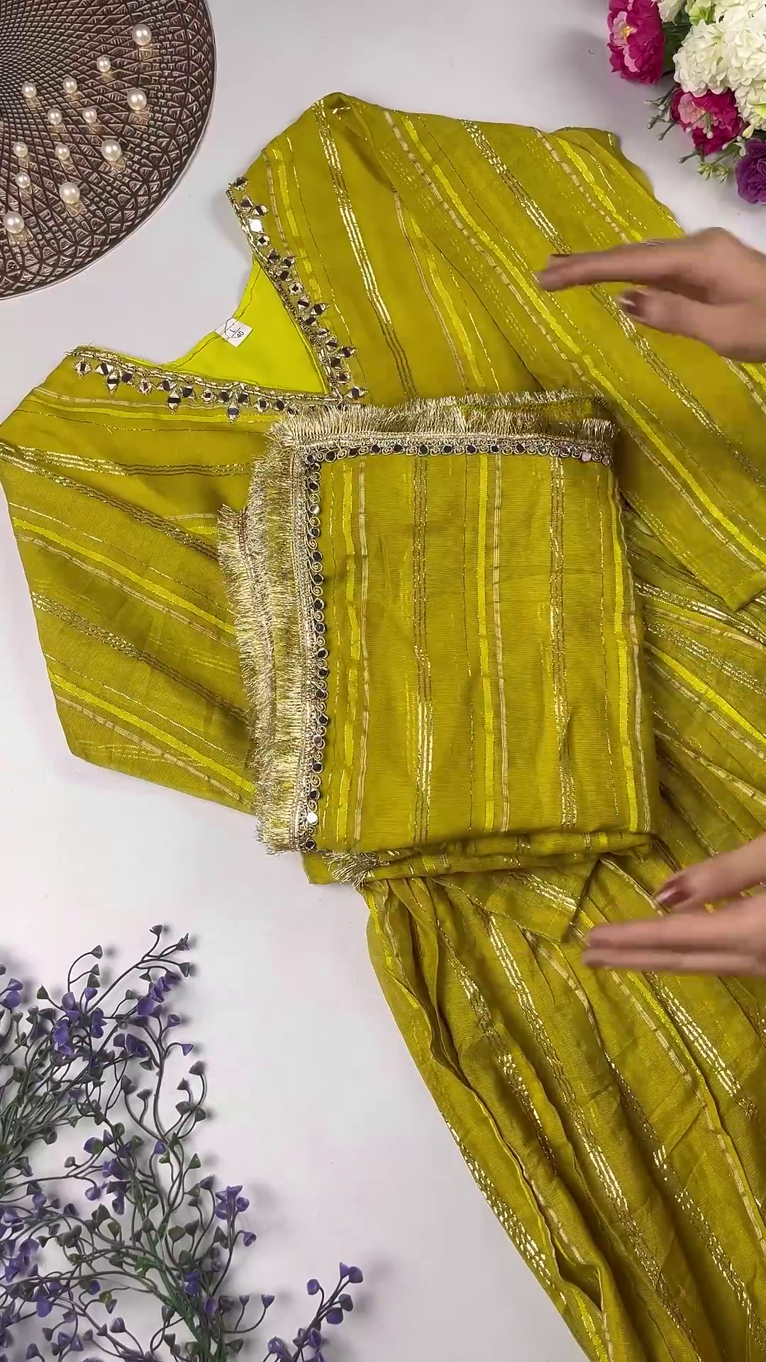 Pair with traditional gold or kundan jewelry to complement the rich mirror-work and golden lurex stripes.