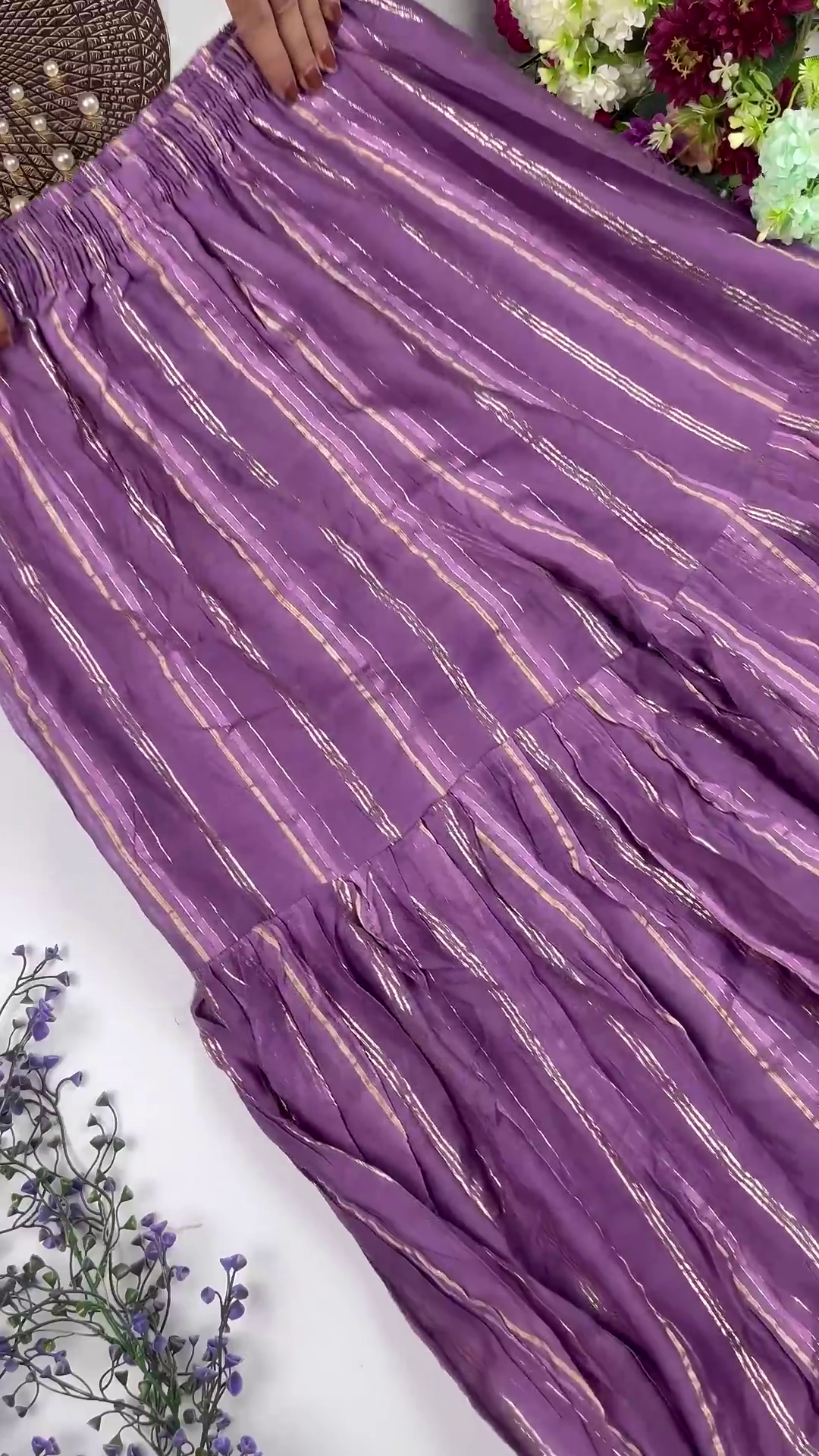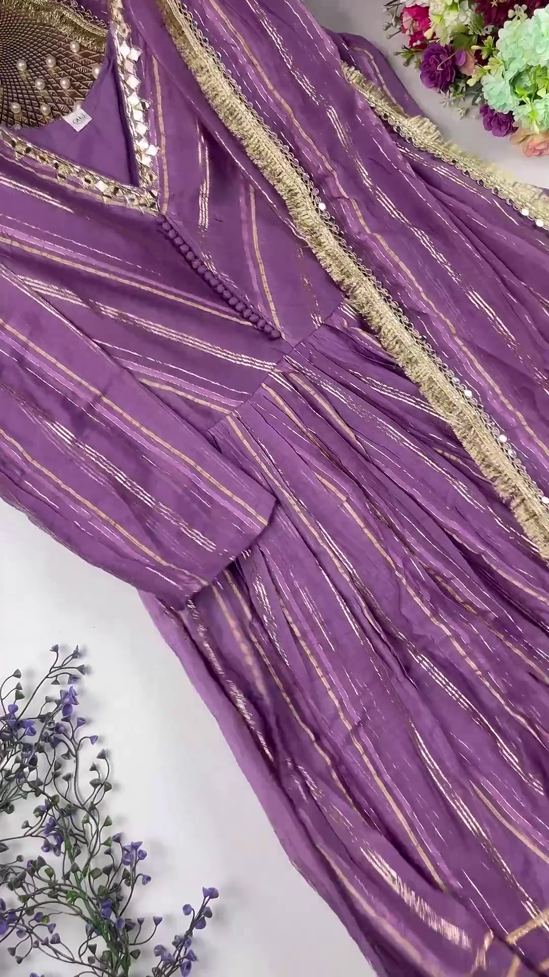 This gown set is an ideal choice for Sangeet nights, Wedding Receptions, and grand festive galas. The light-reflecting lurex stripes and mirror-work make this outfit exceptionally striking for evening events under professional lighting.
