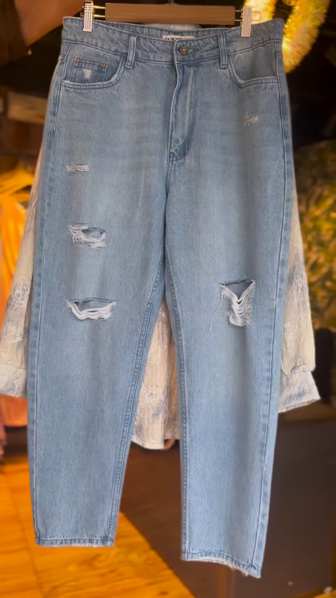 Whether styled with canvas sneakers, strappy flats, or platform sandals, this look works across age groups and styling preferences. Toss on a tote, a dainty wristwatch, or minimalist rings to balance accessories without overwhelming the vibe. The in-store hanger setup adds realism and boutique relevance, ideal for visual merchandising or digital storefronts emphasizing casual fashion curation.