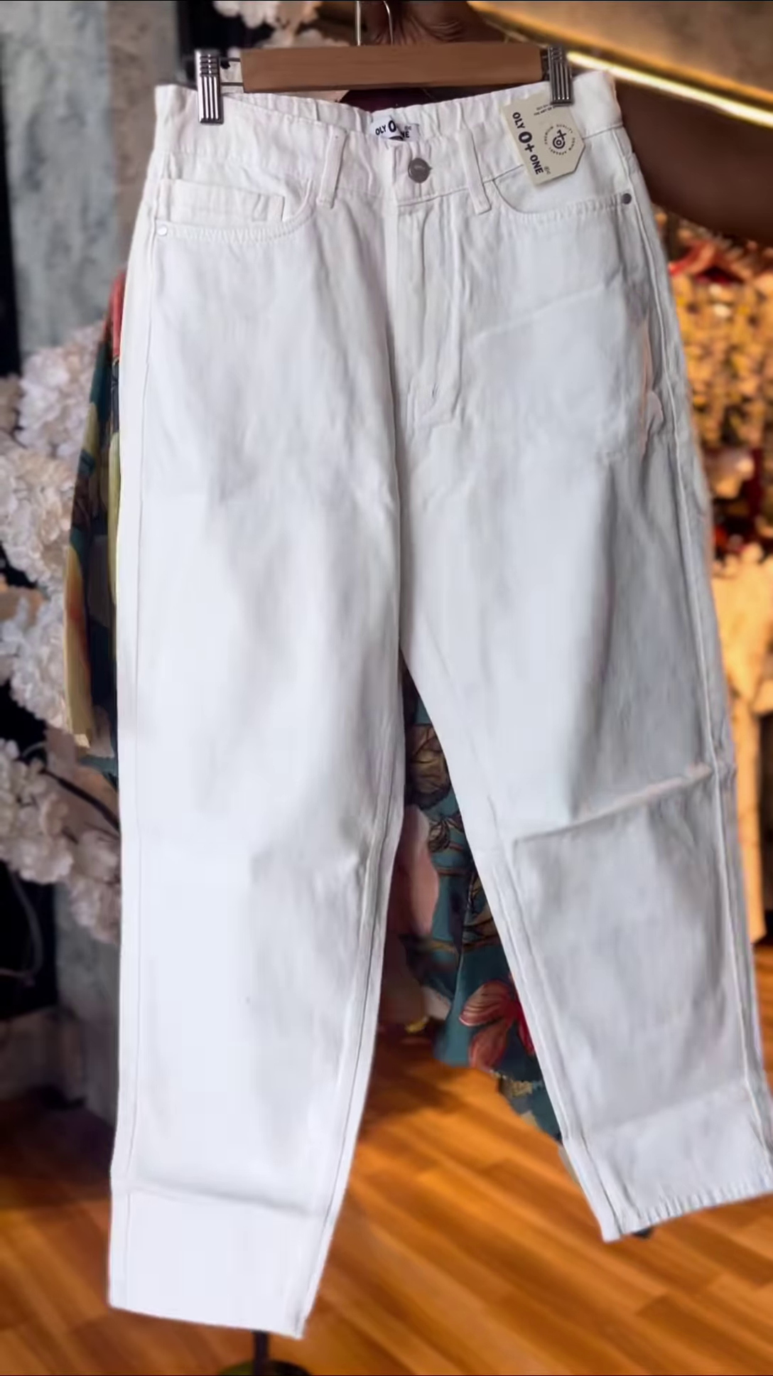Paired with the blouse are crisp white pants, providing structure and tonal contrast. Their slim silhouette keeps the overall look sleek and modern, making the outfit suitable for a variety of settings—from art walks and brunch outings to retail window displays and lifestyle shoots. The combination of airy fabric above and tailored refinement below creates visual balance and wearability.