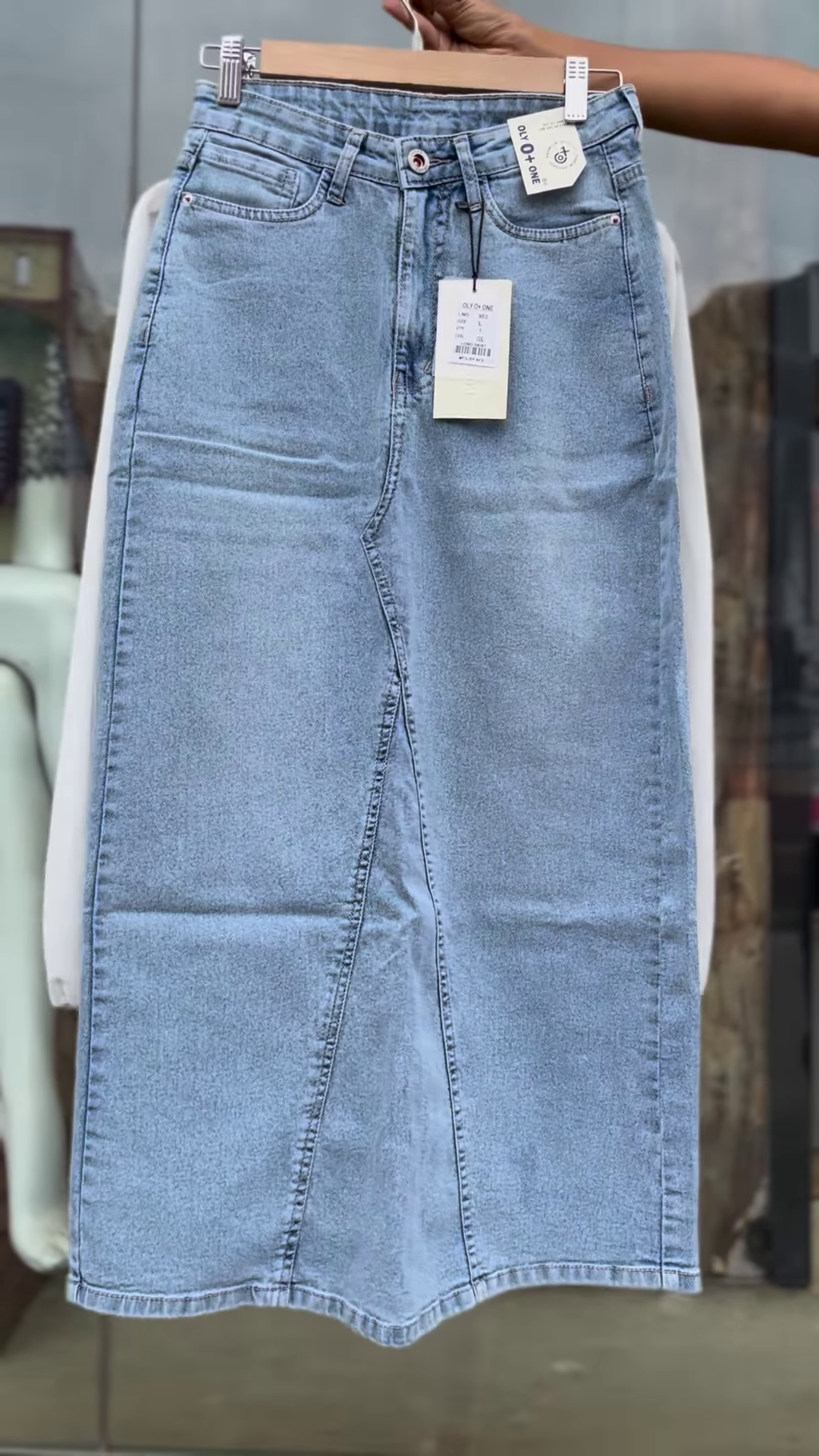 Presented neatly on a wooden hanger with a boutique mannequin visible in the backdrop, the image speaks to retail authenticity and curated simplicity. It’s well-suited for content creators, casual capsule lookbooks, or storefront layouts aiming to convey freshness and realism in fashion visuals.